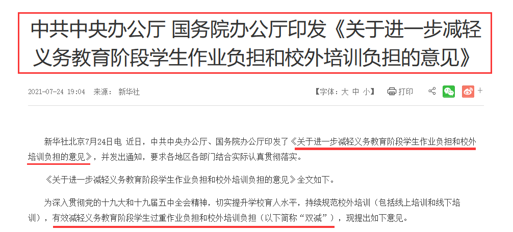 教育是百年大計(jì),為管理校外培訓(xùn)不斷標(biāo)準(zhǔn)規(guī)范化,近期,中共中央辦公廳、國務(wù)院下發(fā)了有關(guān)于進(jìn)一步減少九年義務(wù)基礎(chǔ)教育階段的《意見》和“雙減”(如下圖),引起社會(huì)的諸多觀注。