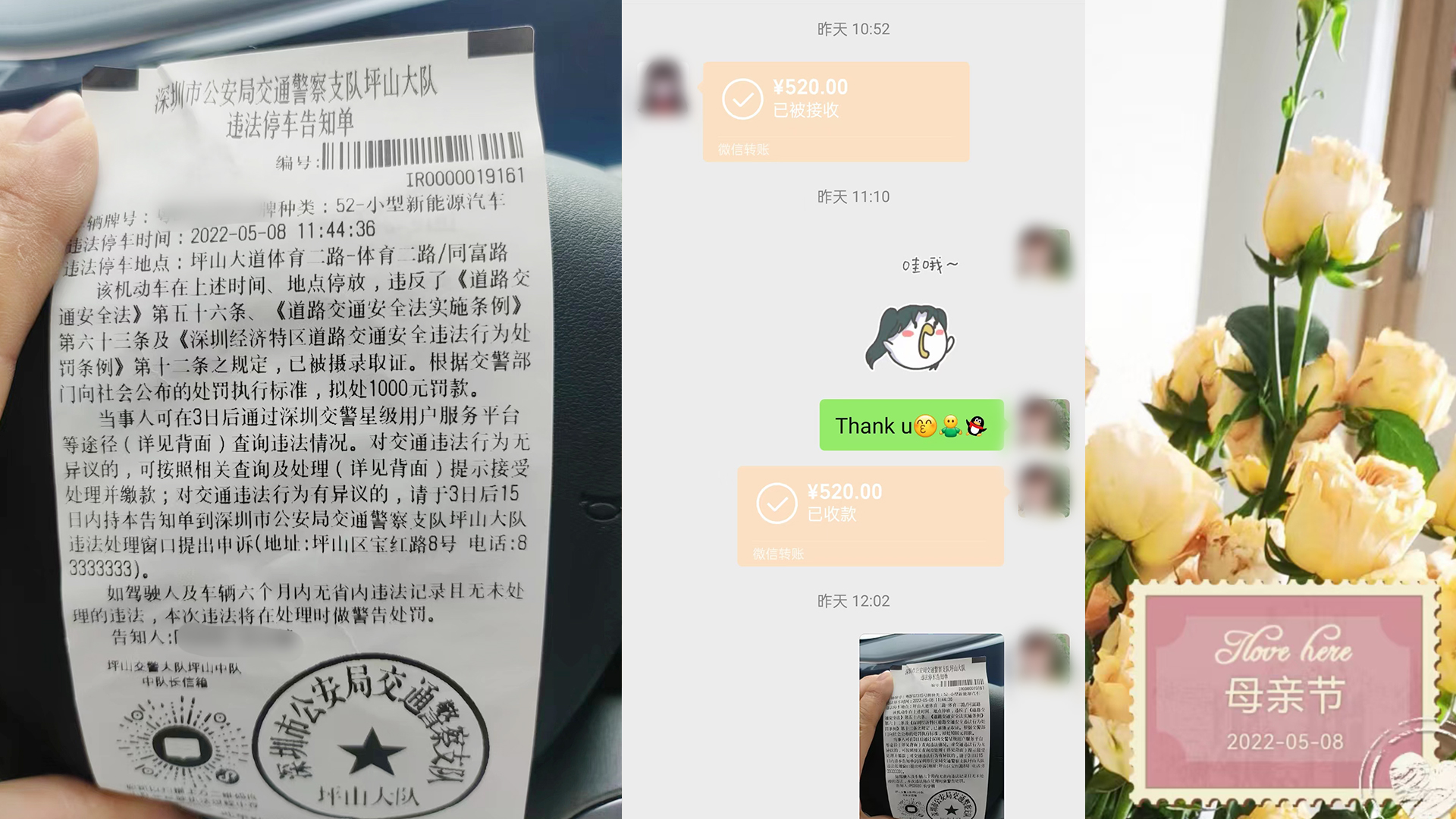 這次母親節(jié)活動(dòng)我有點(diǎn)不解,不僅微信紅包的金額沒有擴(kuò)大,還沒有默認(rèn)紅包母親節(jié)快樂的祝福語,但是這也阻擋不了對(duì)母親的愛。下面這位母親在母親節(jié)收到了520的轉(zhuǎn)賬,但是出了點(diǎn)意外,母親節(jié)外出和朋友聚餐,不小心違反了交通規(guī)則,收到了違法停車告知單,被罰1000元罰款。我認(rèn)為這位母親也是收到了最好的禮物,畢竟我看大部分人都只是發(fā)紅包,這個(gè)轉(zhuǎn)賬最直觀的表達(dá):我愛你,母親!