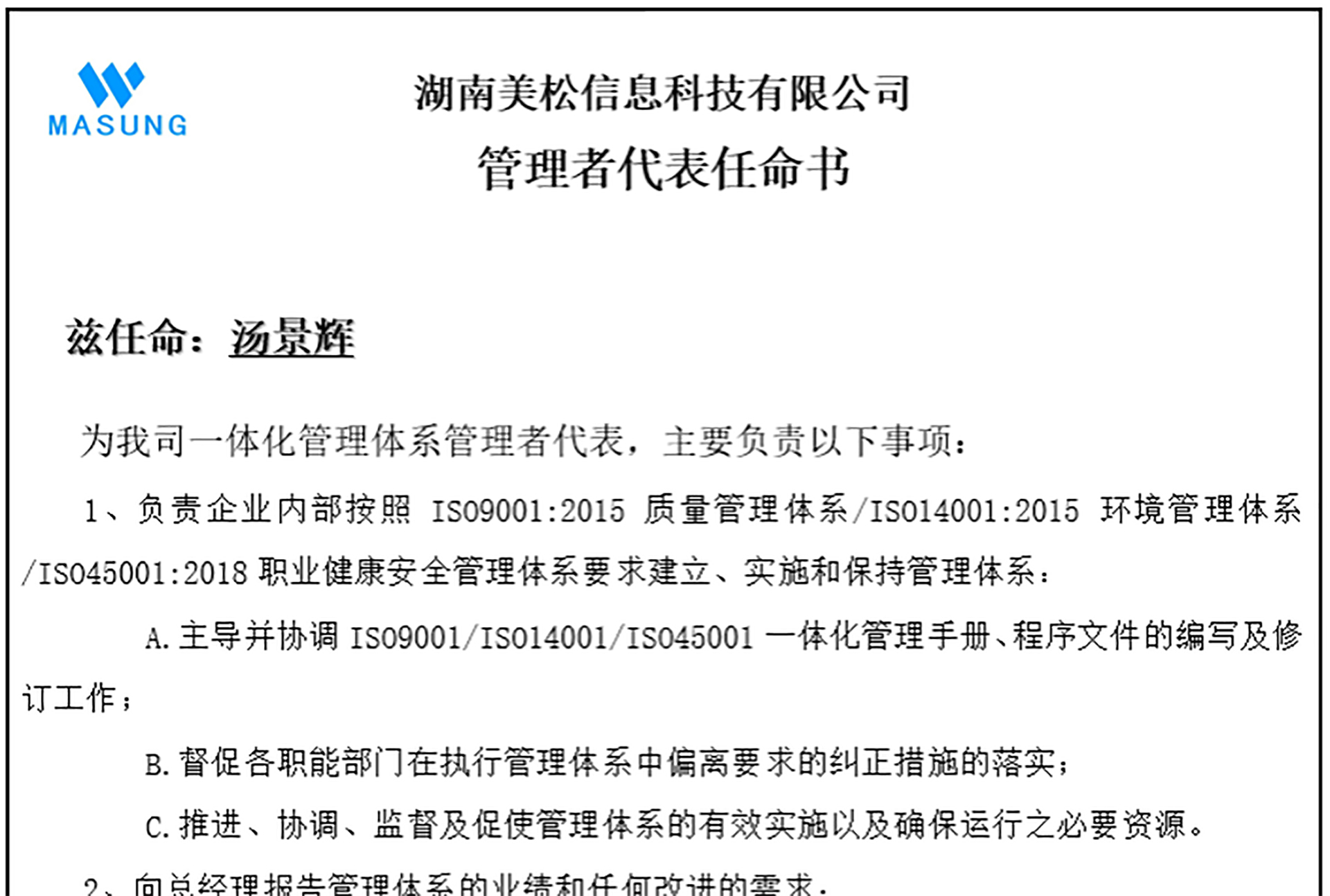 會議最后,饒老師激勵大家:體系管理絕非一朝一夕之功,而是一項需要不斷學(xué)習(xí)、改進和堅持的長期工程。在座每一位美松人都是體系建設(shè)的主力軍,也是公司持續(xù)發(fā)展的中堅力量。未來愿與美松一起在體系管理的道路上不斷探索、不斷創(chuàng)新。以ISO系列體系為支撐,必將打造品質(zhì)+綠色+安全MASUNG美松的企業(yè)品牌,創(chuàng)造更多的價值。