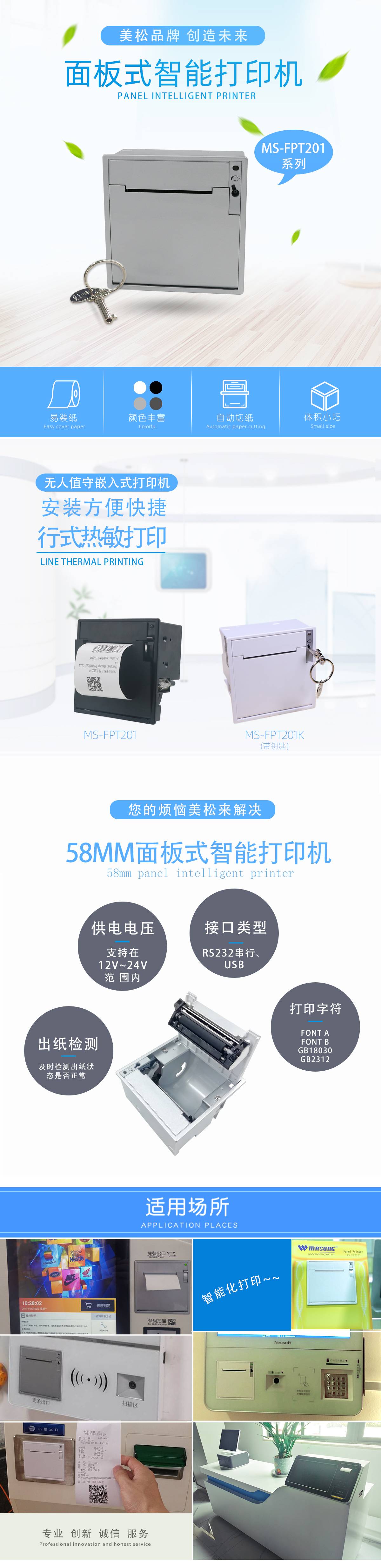 微型打印機(jī)介紹:與80mm微型熱敏打印機(jī)不同,這款是58MM的微型打印機(jī),型號為MS-FPT201微型打印機(jī)是一款58mm嵌入式微型打印機(jī),體積小巧,塑膠材料外殼,機(jī)身重量輕巧,配有鋅合金鑰匙開蓋,滿足不同需求的應(yīng)用場合,只需要簡單安裝就能實(shí)現(xiàn)打印功能的打印模塊,嵌入在不同的終端設(shè)備,例如加油站、餐飲收銀機(jī)、排隊繳費(fèi)機(jī)等,微型熱敏打印機(jī)是排隊機(jī),POS機(jī),加油站設(shè)備及醫(yī)療掛號繳費(fèi)等行業(yè)自助終端打印設(shè)備。