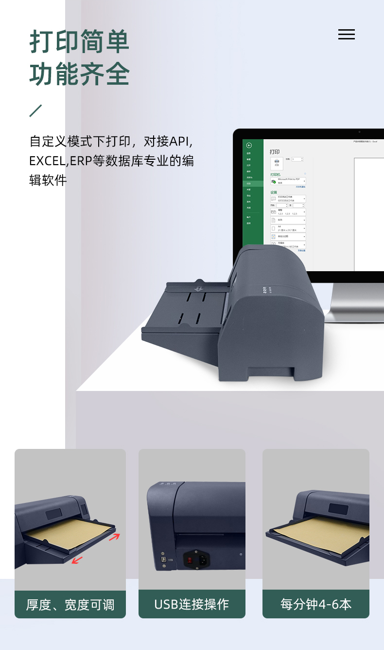 美松MASUNG自主研發(fā)熱轉(zhuǎn)印封面打印機(jī) 1.專業(yè)打印牛皮紙,不動(dòng)產(chǎn)等證件內(nèi)頁(yè),無(wú)酸紙檔案盒 2.對(duì)接API,EXCEL,ERP等數(shù)據(jù)庫(kù)專業(yè)的編輯軟件,自定義打印 3.USB連接操作簡(jiǎn)單,耗材成本低,長(zhǎng)久保存 4.快速打印,每分鐘4-6本,整齊規(guī)范化 5.進(jìn)紙厚度可調(diào),適合不同封面打印