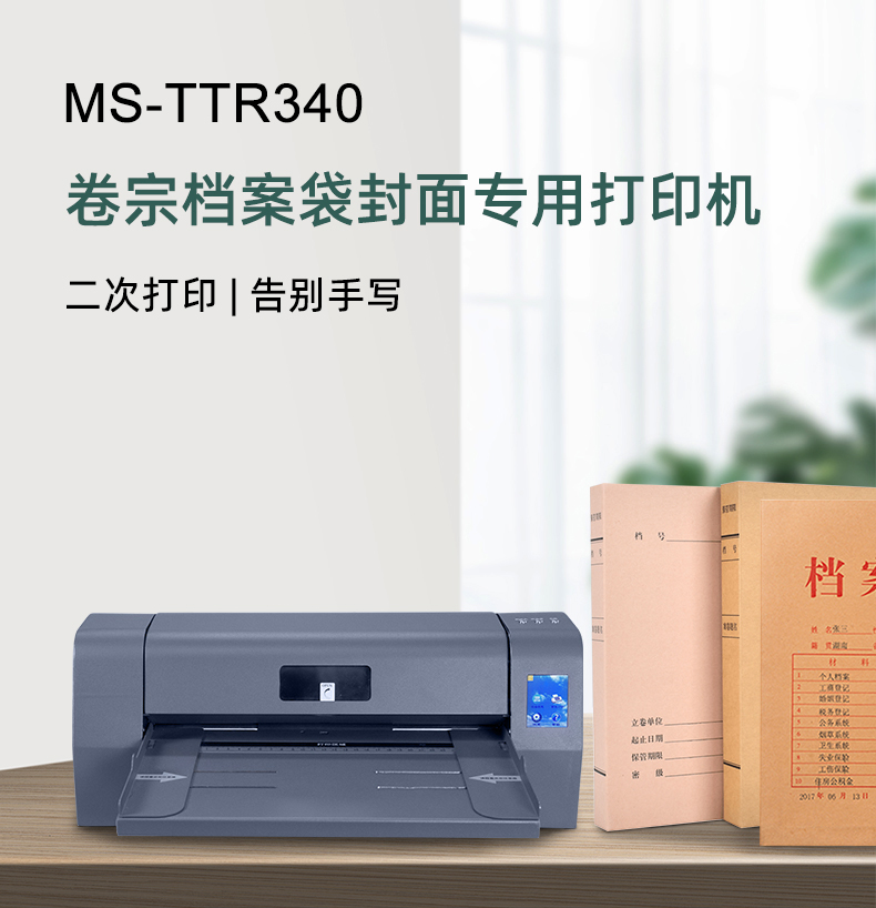 美松MS-TTR340熱轉(zhuǎn)印打印機(jī),熱轉(zhuǎn)印設(shè)備是A4/A3卷宗封面打印機(jī),針對(duì)已印刷卷皮封面進(jìn)行二次加印的設(shè)備,或單張空白版面牛皮紙,無(wú)酸紙進(jìn)行打印.采用碳帶熱轉(zhuǎn)印方式打印,文字清晰耐刮永不褪色.電腦排版完即可通過(guò)USB打印無(wú)需制版,方便快捷成本低廉,機(jī)構(gòu)可靠性高,操作,維護(hù)簡(jiǎn)單.