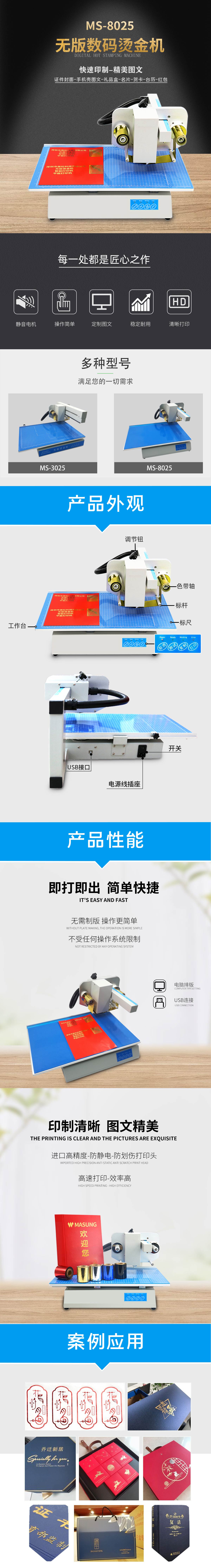 美松無版數(shù)碼燙金機(jī)MS-8025采用日本原裝rohm打印頭,最新設(shè)計(jì)徹底取代傳統(tǒng)的燙金機(jī)。身材小巧、節(jié)約空間重量、方便移動(dòng);最大打印厚度可達(dá)30mm、用途廣泛。軟件控制、可加工復(fù)雜圖案文字照片等,可在不光滑的卡紙、皮革上燙印各種圖案文字。用戶無需制版、開模,功率低,經(jīng)濟(jì)快捷,簡單操作,一看即懂,輕松自如。