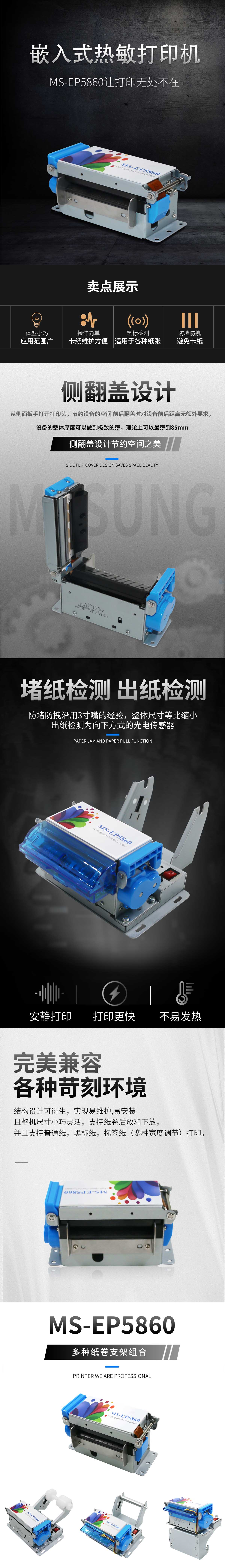 MS-EP5860是一款嵌入式熱敏不干膠票據(jù)打印機(jī),采用側(cè)翻蓋設(shè)計(jì),打印質(zhì)量可靠;為滿足市場需要,可定制不同的支架結(jié)構(gòu),集成度高,體積小,兼容性強(qiáng);熱敏紙打印可選配專利技術(shù)防堵紙放拽紙出紙嘴;黑標(biāo)紙打印配有多種傳感器定位;不干膠打印配有探縫傳感器檢測,為終端設(shè)備提供多種打印功能的打印機(jī).