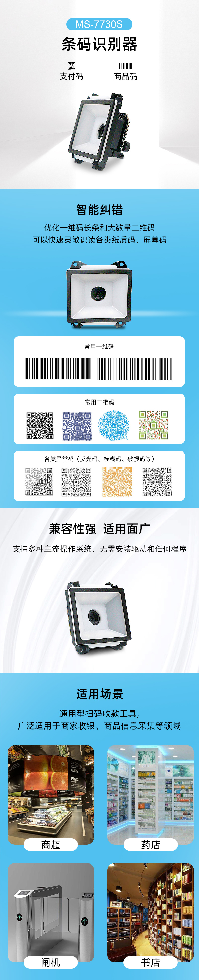 通過(guò)國(guó)家電子健康卡認(rèn)證(7730S) 兼具一維/二維碼;4mil紙質(zhì)和手機(jī)碼掃描 支持“貼面”和快速移動(dòng)過(guò)程中識(shí)讀 內(nèi)置RS232\USB接口和蜂鳴器 28MM超薄設(shè)計(jì)更宜集成 支持陽(yáng)光下和完全黑暗環(huán)境識(shí)讀