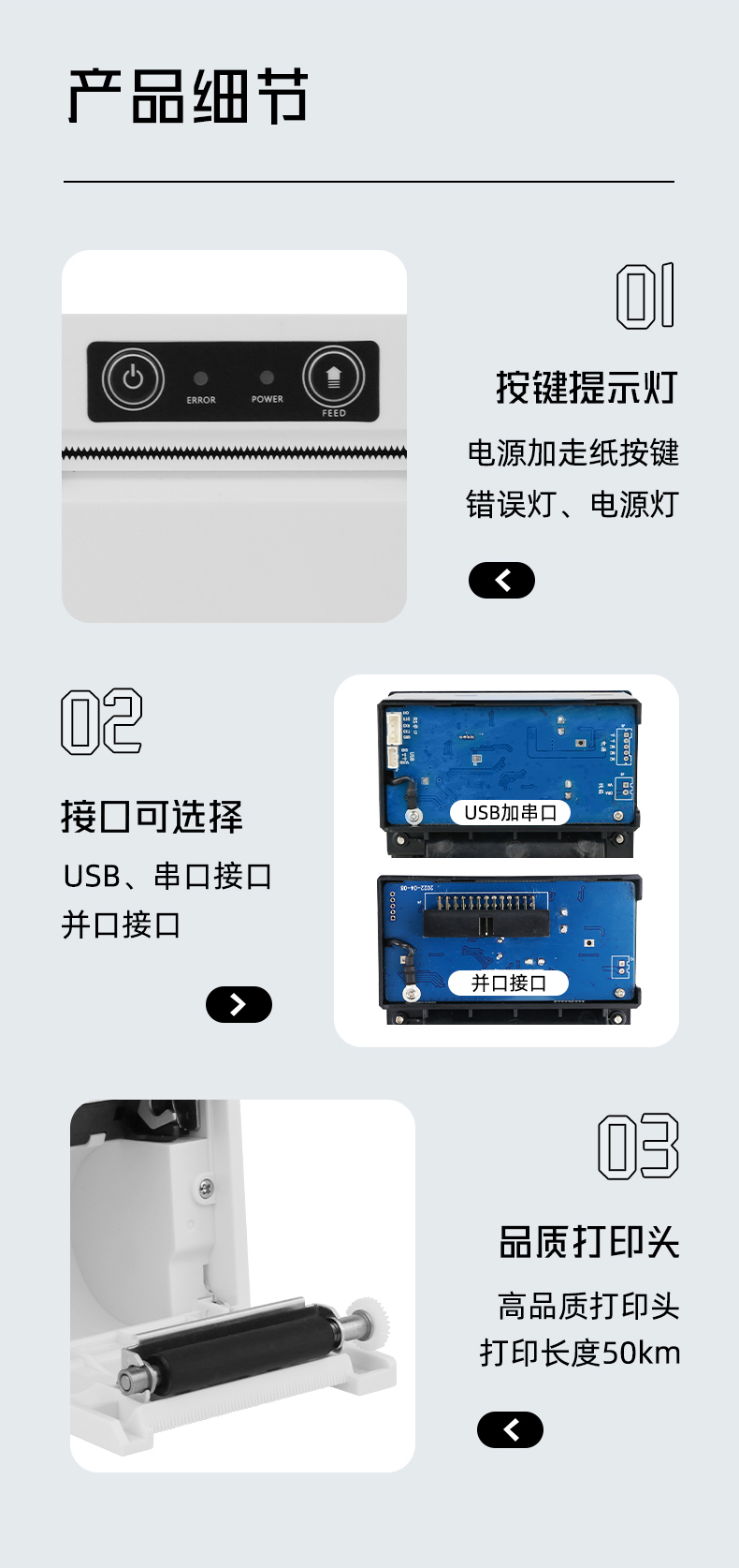 1.易裝紙結(jié)構(gòu) 2.低噪音熱敏打印 3.支持錢箱接口 4.支持圖文打印 5.紙卷60毫米外徑紙卷 6.大齒輪、大膠輥、大馬達(dá)機(jī)芯設(shè)計耐用可靠 7.支持Web打印,以及多種驅(qū)動Windows,Linux,Android