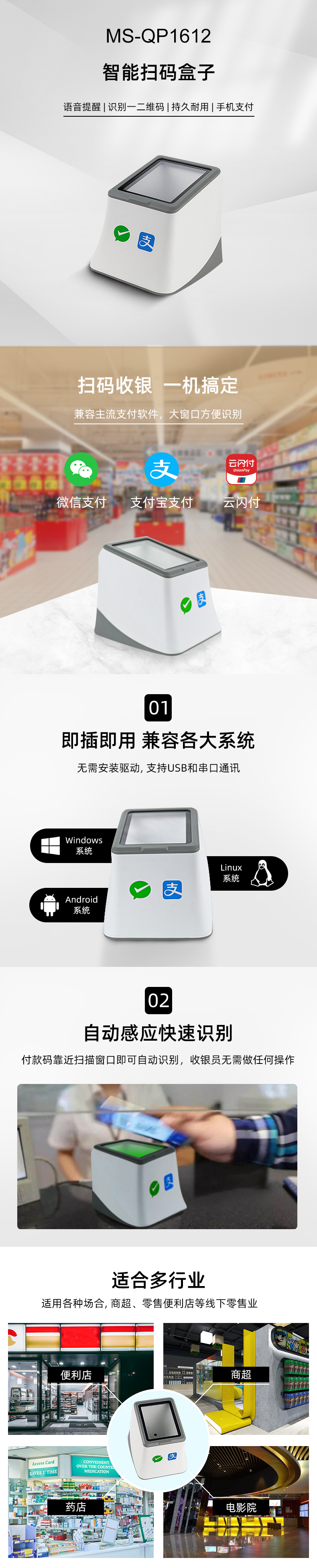 1.大窗口,經(jīng)典外觀,支持貼屏掃碼 2.支持微信、支付寶、美團(tuán)等掃碼支付 3.掃碼成功語音播報(bào) ,解放收銀員,避免漏單 4.接口豐富,內(nèi)置RS232 和USB接口