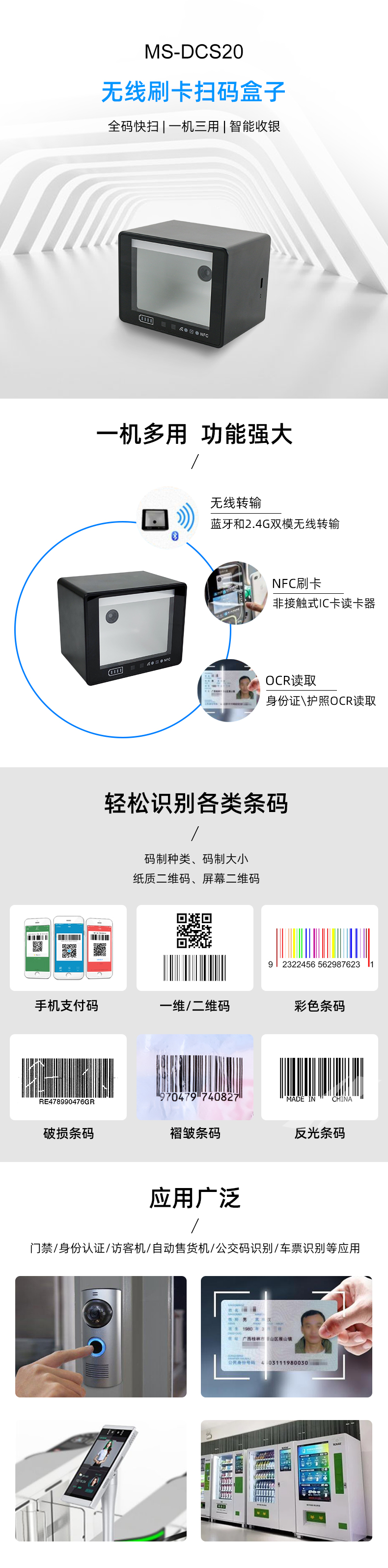 二維碼掃描器行業(yè)應(yīng)用:二維碼掃描器MS-DCS20可桌面亦可嵌入、會(huì)議簽到、訪客機(jī)、門禁、身份認(rèn)證、身份證護(hù)照OCR讀取,支付、醫(yī)療自助、排隊(duì)機(jī)等,尤其適用于高密紙質(zhì)、手機(jī)碼、要求貼近掃描、需要讀身份證OCR、刷IC卡、無(wú)線傳輸應(yīng)用的場(chǎng)景。二維碼掃描器MS-DCS20實(shí)現(xiàn)藍(lán)牙和2.4G雙模傳輸;選配刷卡模塊可支持13.56Mhz 非接觸式 IC 卡讀卡器,支持 Type A/B 卡識(shí)讀;OCR讀取可讀取OCR-A/B數(shù)字,領(lǐng)先的解碼技術(shù),采用自主研發(fā)的核心技術(shù),極速響應(yīng),支持快速開發(fā)和定制需求。