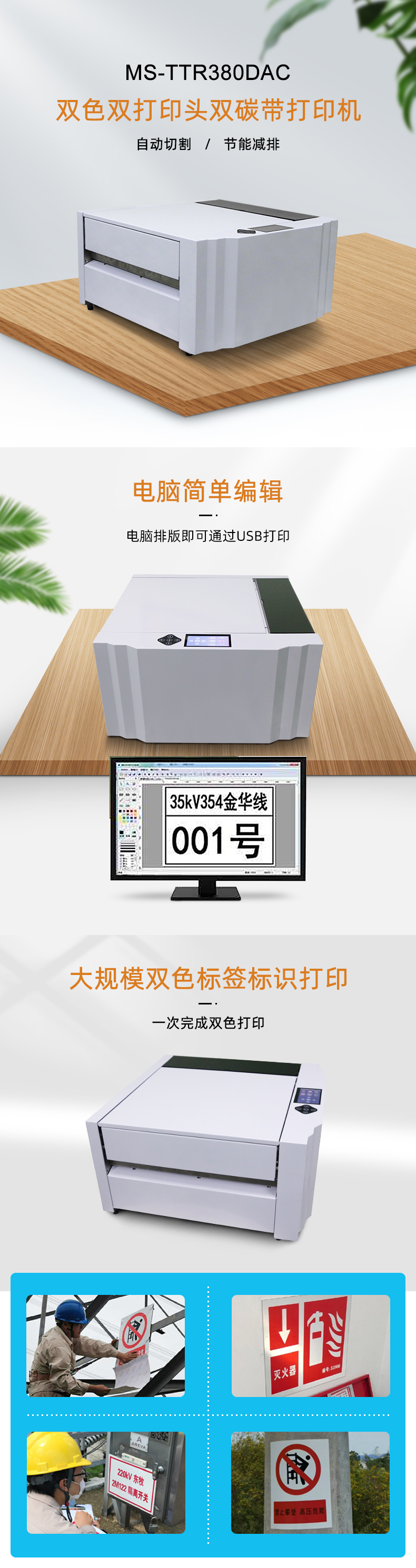 美松MASUNG自主研發(fā)熱轉(zhuǎn)印雙色標(biāo)識(shí)牌打印機(jī) 1.打印大幅面標(biāo)示牌,且自動(dòng)切割 2.無(wú)需制版,電腦排版完通過(guò)USB打印,方便快捷 3.碳帶熱轉(zhuǎn)印方式打印,文字清晰耐刮永不褪色 4.支持PVC+貼合鋁箔復(fù)合材料、PVC標(biāo)識(shí)貼紙材料等打印 5.熱轉(zhuǎn)印打印防水防曬耐腐蝕,經(jīng)久耐用