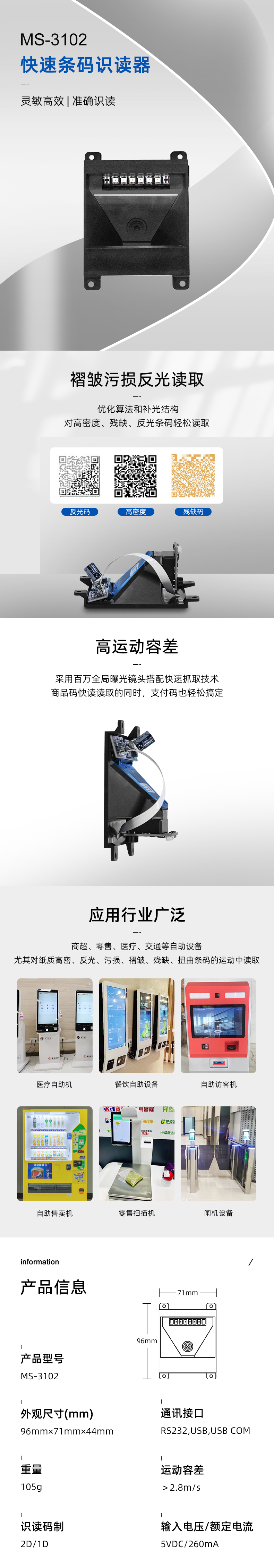 領(lǐng)先解碼技術(shù) 采用自主研發(fā)的核心技術(shù),極速響應(yīng),支持快速開發(fā)和定制需求 高運動容差 采用百萬全局曝光鏡頭搭配快速抓取技術(shù),實現(xiàn)在運動過程中快速讀取 支持商品碼和支付碼 針對商超零售場景特殊優(yōu)化,商品碼快讀讀取的同時,支付碼也輕松搞定 褶皺污損反光讀取 優(yōu)化算法和補(bǔ)光結(jié)構(gòu),對高密度、殘缺、反光條碼輕松讀取