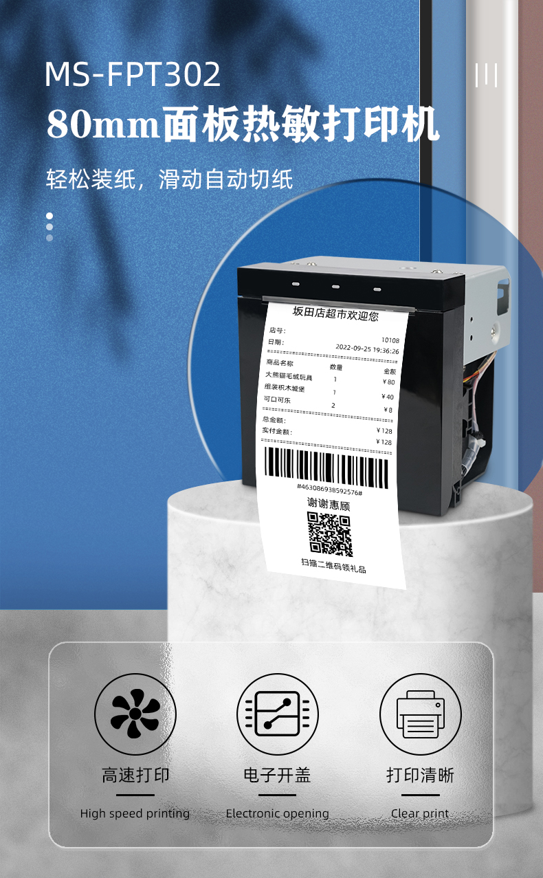 MS-FPT302是一款面板嵌入式自助打印機(jī),專業(yè)的熱敏票據(jù)打印機(jī),用于醫(yī)療、零售、政務(wù)等行業(yè)的自助終端設(shè)備。水平面蓋嵌入,高端大氣,無人值守打印機(jī)適配無人無接觸式服務(wù)設(shè)備。