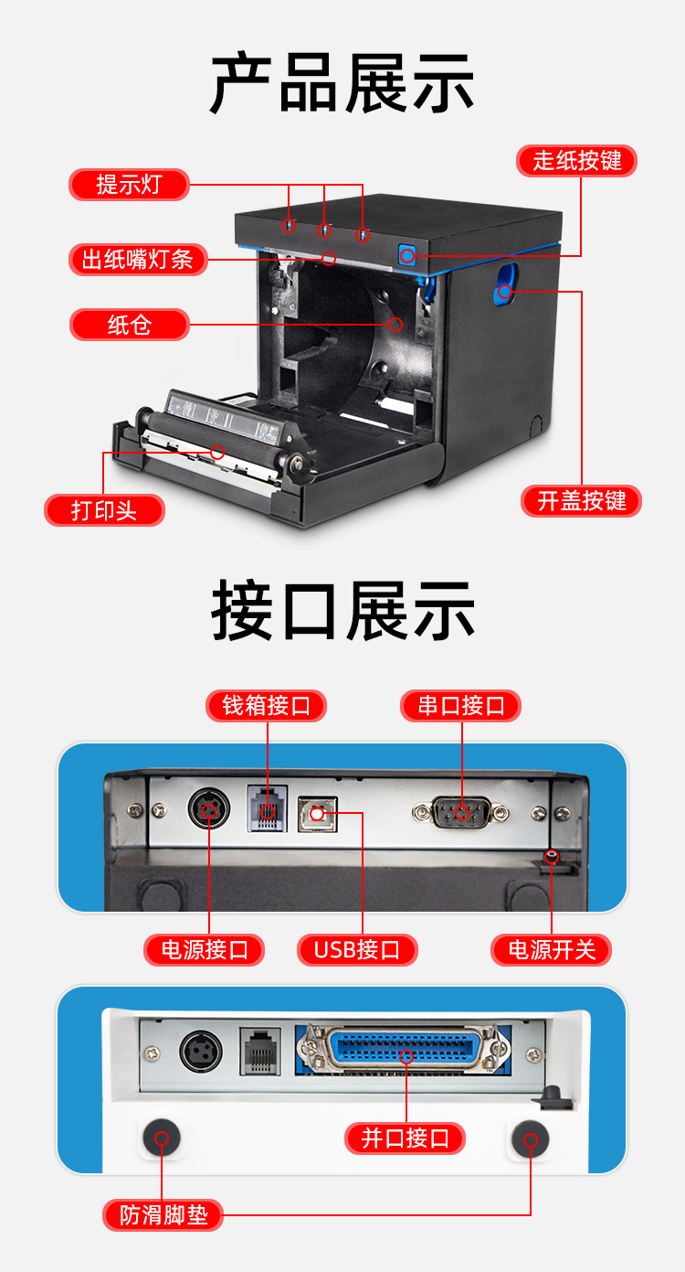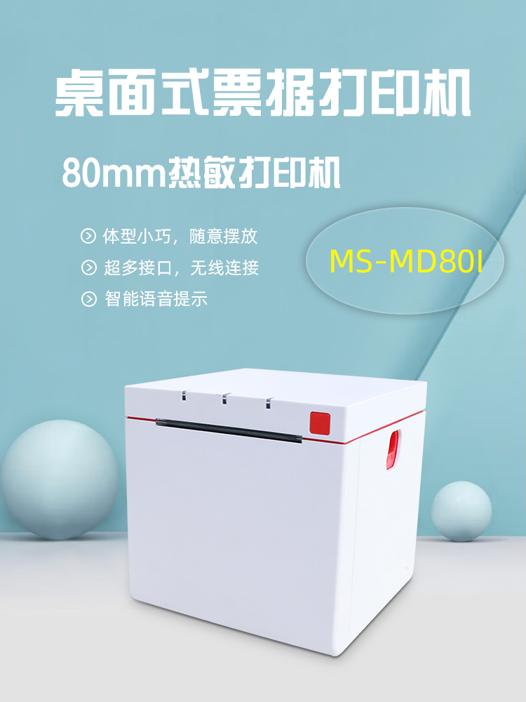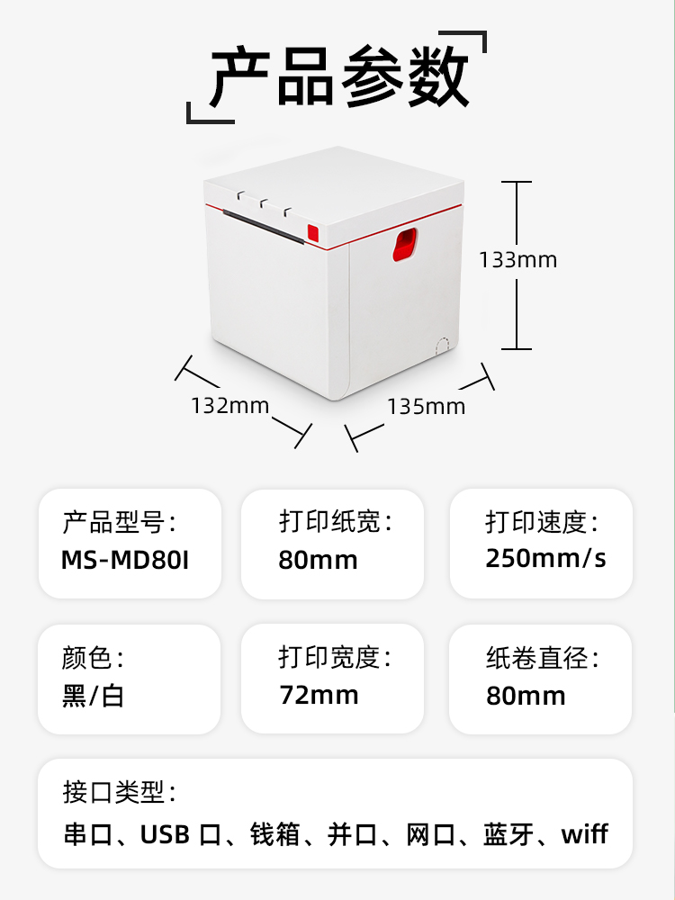 MD80I是一款高顏值的可桌面也可壁掛的票據(jù)打印機(jī)。MD80I外形四四方方的,圓潤(rùn)一體設(shè)計(jì)、簡(jiǎn)于外,精于內(nèi)。流線造型,外觀簡(jiǎn)潔大方。顏色搭配顯得更加干凈整潔,可內(nèi)嵌于一些自助ai設(shè)備上,也可直接進(jìn)行使用。MS-MD80I是一款全能的桌面式壁掛式票據(jù)打印機(jī),適用于零售商超、中小電商、倉(cāng)儲(chǔ)物管、影院娛樂等行業(yè)領(lǐng)域,支持簡(jiǎn)體/繁體、英/日/韓文多種國(guó)際語(yǔ)言,新零售、跨境電商、影院更適合。MS-MD80I擁有超高速打印速度,采用高級(jí)強(qiáng)勁機(jī)芯,打印速度可高達(dá)250MM/S成為市面上同類產(chǎn)品中快速打印的佼佼者,清晰穩(wěn)定與高速皆可兼得帶來(lái)顧客滿分體驗(yàn)。MS-MD80I擁有豐富的可選接口,支持RS232串口、USB、網(wǎng)口,可選配藍(lán)牙、WiFi等接口、同時(shí)支持24V錢箱接入、滿足不同的連接需求。專業(yè)黑標(biāo)定位功能,前出紙打印,無(wú)線連接,藍(lán)牙接口連接,WiFi接口連接,USB連接,打印機(jī)外殼材質(zhì)高端,內(nèi)置機(jī)芯打印速度快。