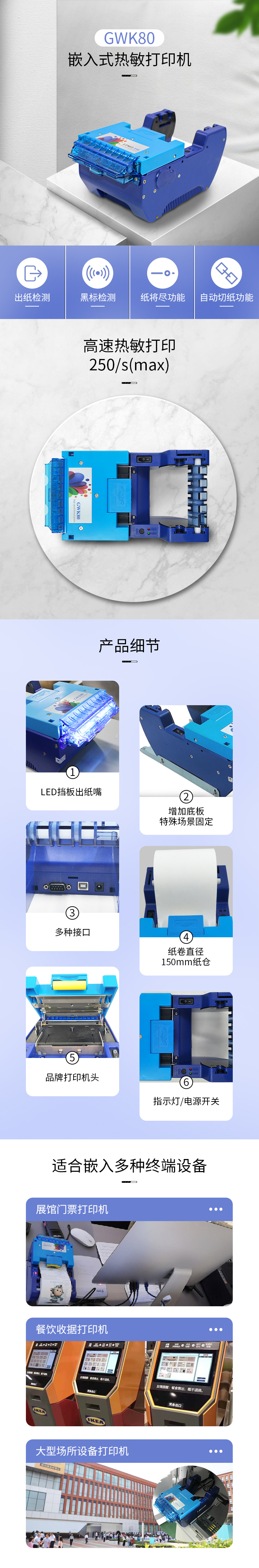 GWK80自助零售餐飲收銀小票機(jī),票據(jù)單據(jù)收據(jù)專用打印機(jī) 送貨單銷貨單打印,80mm熱敏打印機(jī),可打印80毫米或82.5毫米的紙寬,入紙口與出紙口水平出紙,為走紙?zhí)峁╊愃茩C(jī)場跑到的場地,極大限度保證走紙順暢,避免打印卡紙,降低打印故障,防堵防拽LED擋板出紙嘴,隨時檢測走紙情況,黑標(biāo)檢測功能,檢測黑標(biāo)位置并實(shí)現(xiàn)打印,適用于電影院和彩票等行業(yè).GWK80適用于打印量大、打印內(nèi)容特殊化、票據(jù)格式多樣化等行業(yè)的應(yīng)用,應(yīng)用場景多見于醫(yī)院、銀行、政務(wù)、交通等人流量較多的行業(yè)。