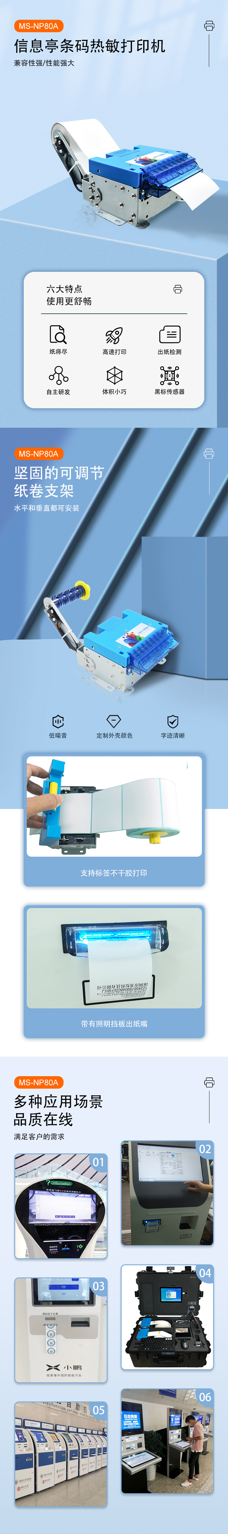 隨著疫情的影響,無(wú)人自助式終端設(shè)備的需求也在逐漸變大,無(wú)人自助式終端設(shè)備往往由多個(gè)小型設(shè)備構(gòu)成,其中就需要微型的嵌入式打印機(jī),為了實(shí)現(xiàn)自助終端設(shè)備的穩(wěn)定性,需要打印機(jī)具有良好的性能,MS-NP80A具有體型小巧,高集成度等特點(diǎn)可方便嵌入各種自助設(shè)備。