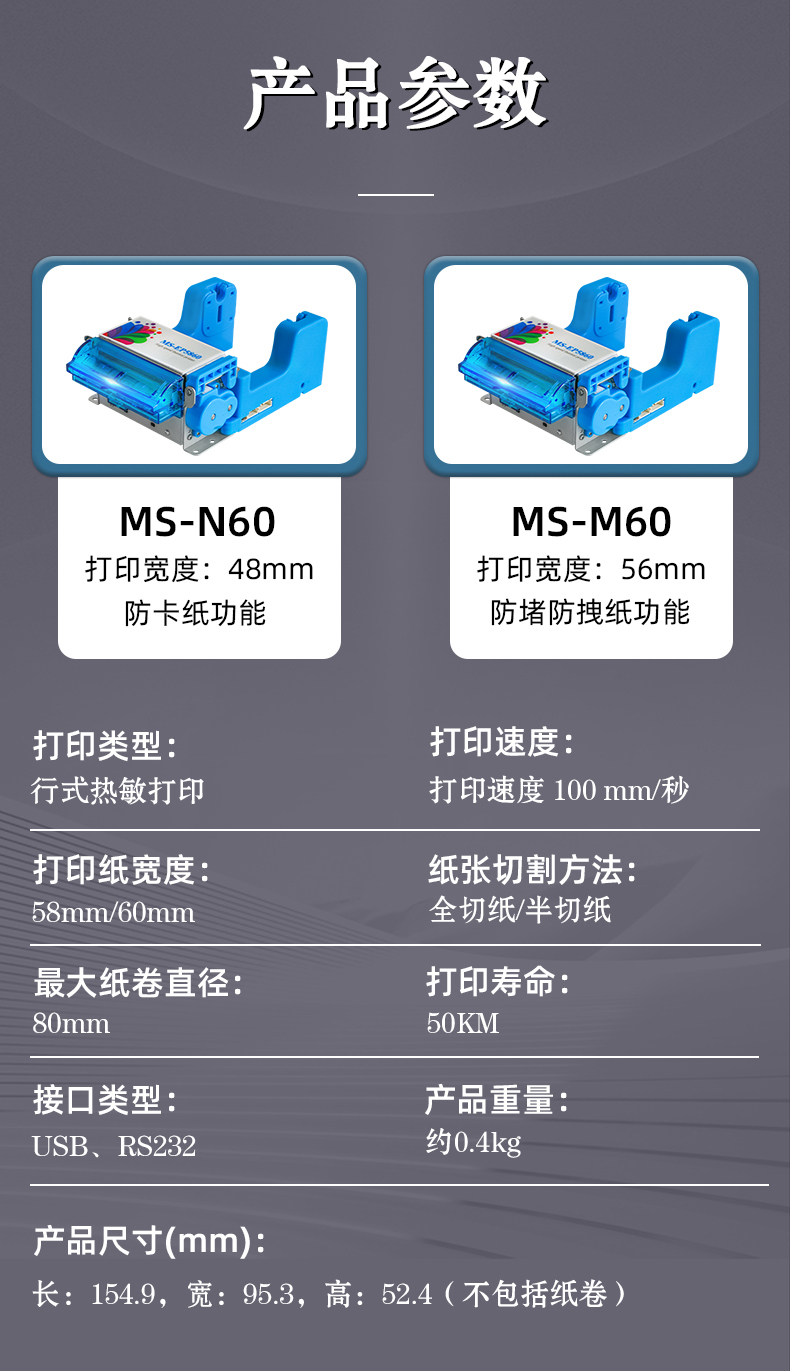 MS-N60/M60是美松全新研發(fā)的一款新的熱敏票據(jù)打印機,完全取代MS-D245熱敏票據(jù)打印機,可打印熱敏不干膠標簽。MS-N60/M60對工作電壓進行了全新的升級,現(xiàn)在的工作電壓在12V±5%V,使自助機的整體運行更方便,具有高亮LED燈光出紙嘴,可對打印頭溫度、缺紙、黑標、紙將盡、防堵、防拽等熱門功能需要進行配置,MS-N60/M60可應用于自助快遞柜、商超存包柜、自助排隊機、自助取票機等多種自助票據(jù)設(shè)備 MS-N60打印的尺寸為48mm;MS-M60打印的尺寸為56mm,帶防堵防拽紙功能。