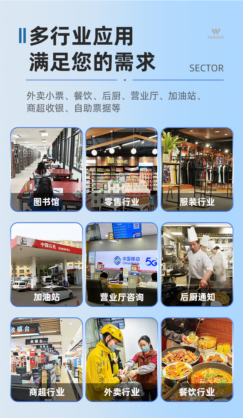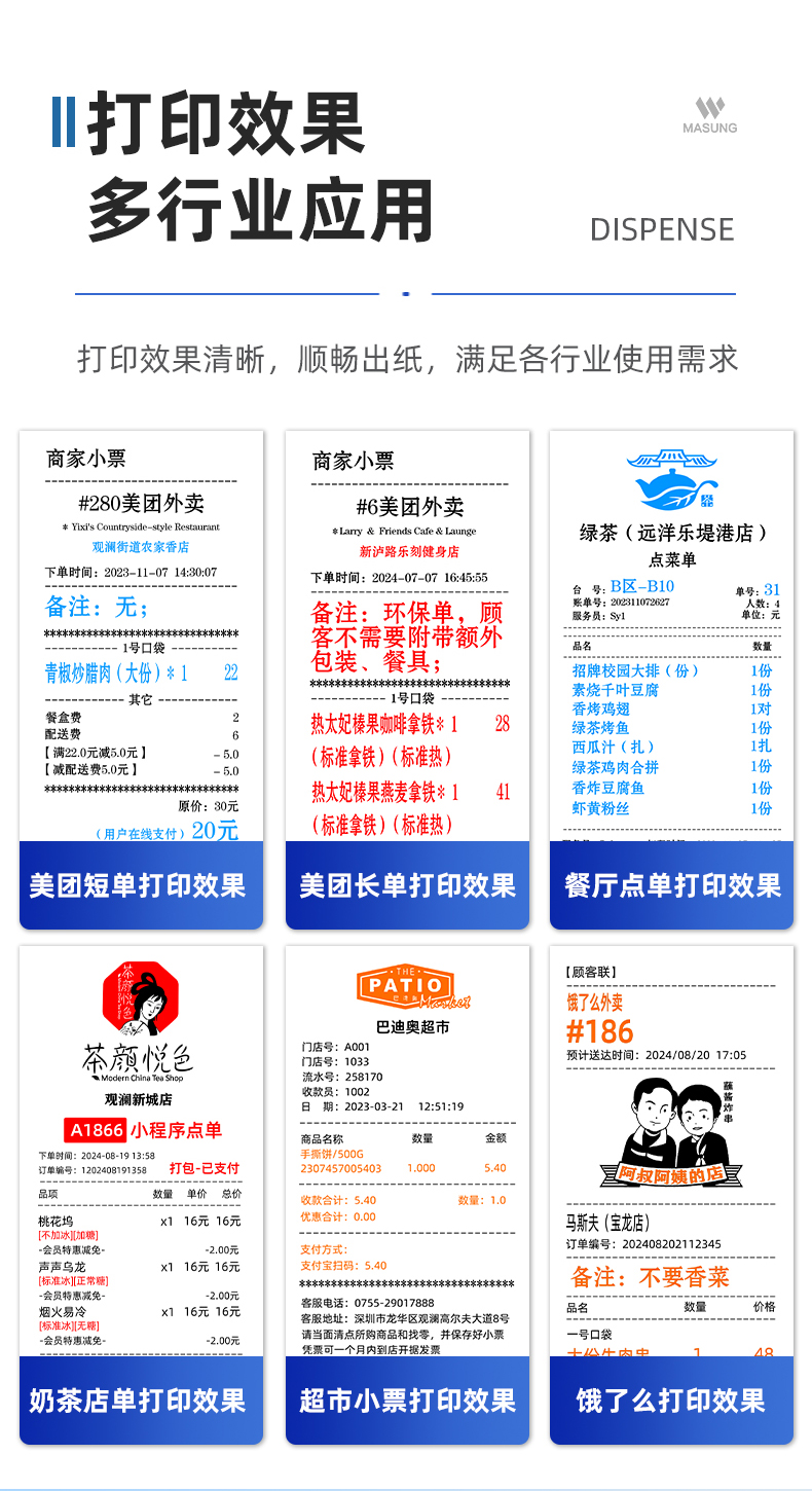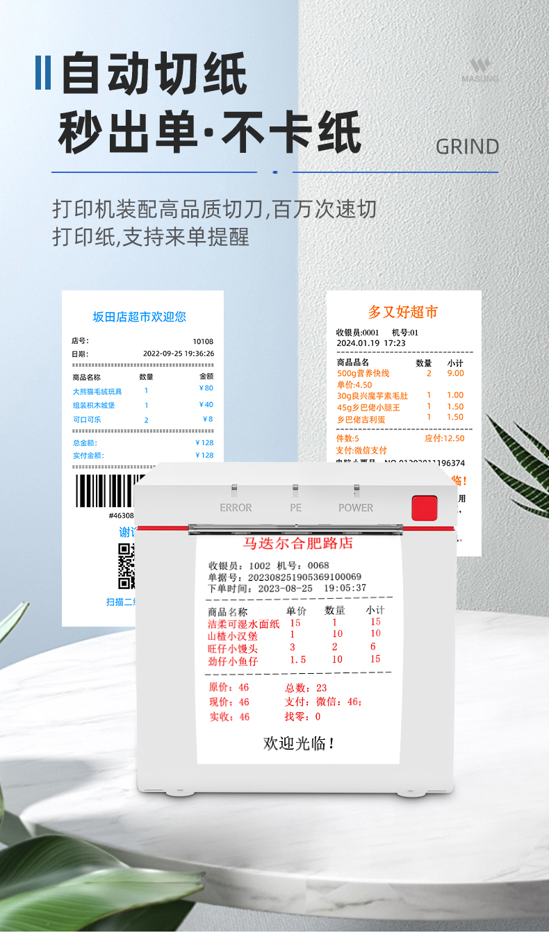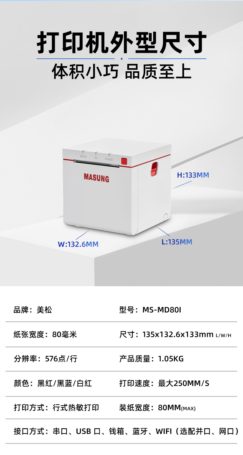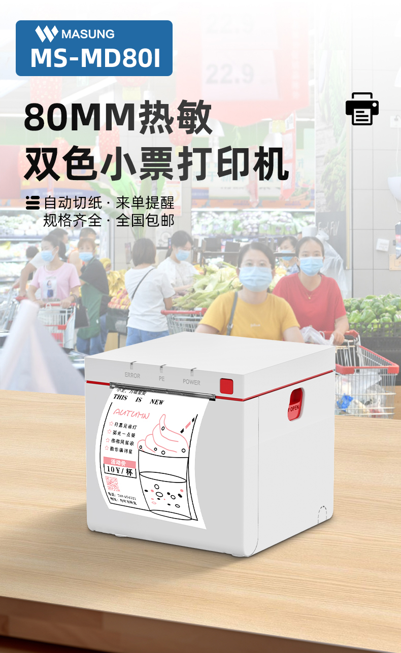 MD80I是一款高顏值的可桌面也可壁掛的票據(jù)打印機。MD80I外形四四方方的,圓潤一體設(shè)計、簡于外,精于內(nèi)。流線造型,外觀簡潔大方。顏色搭配顯得更加干凈整潔,可內(nèi)嵌于一些自助ai設(shè)備上,也可直接進(jìn)行使用。MS-MD80I是一款全能的桌面式壁掛式票據(jù)打印機,適用于零售商超、中小電商、倉儲物管、影院娛樂等行業(yè)領(lǐng)域,支持簡體/繁體、英/日/韓文多種國際語言,新零售、跨境電商、影院更適合。MS-MD80I擁有超高速打印速度,采用高級強勁機芯,打印速度可高達(dá)250MM/S成為市面上同類產(chǎn)品中快速打印的佼佼者,清晰穩(wěn)定與高速皆可兼得帶來顧客滿分體驗。MS-MD80I擁有豐富的可選接口,支持RS232串口、USB、網(wǎng)口,可選配藍(lán)牙、WiFi等接口、同時支持24V錢箱接入、滿足不同的連接需求。專業(yè)黑標(biāo)定位功能,前出紙打印,無線連接,藍(lán)牙接口連接,WiFi接口連接,USB連接,打印機外殼材質(zhì)高端,內(nèi)置機芯打印速度快。