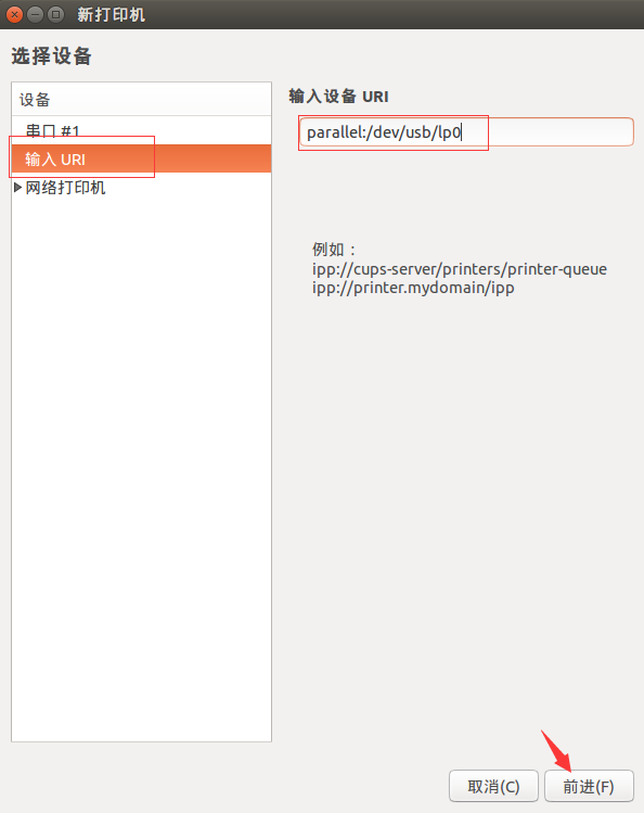 選擇 “輸入URI”,并輸入 “parallel:/dev/usb/lp0”,然后點擊前進(jìn)。