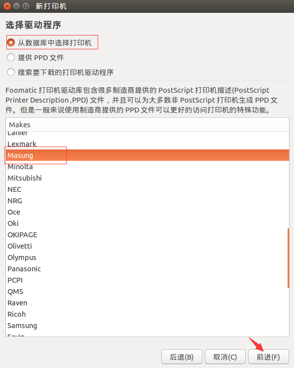 選擇 “從數(shù)據(jù)庫中選擇打印機(jī)”,并選擇 “Masung”,然后點擊前進(jìn)。