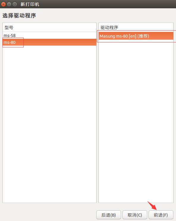 選擇型號以及驅(qū)動程序,然后點擊前進(jìn)。