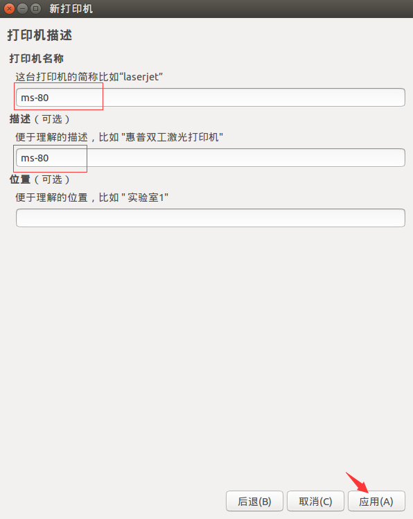 設(shè)置打印機(jī)名稱(自定義)和打印機(jī)描述(自定義),然后點擊應(yīng)用即可。